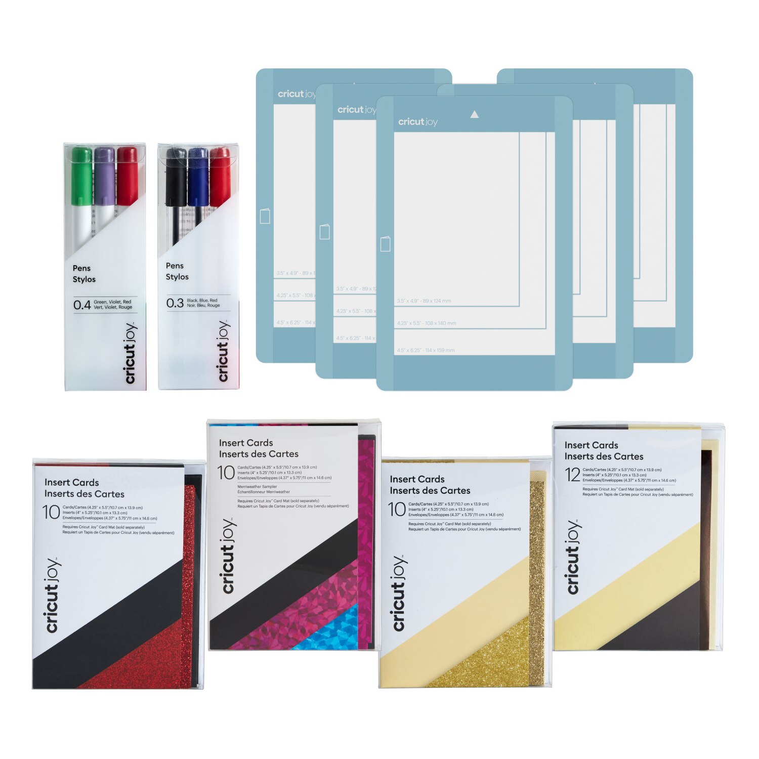Create custom designs. Every cut reveals the complementary hue of the insert inside. Glue-free design allows for two-tone, depth-filled cards. 5 card mats make cutting a breeze. This kit includes cards, complimentary inserts, and envelopes.