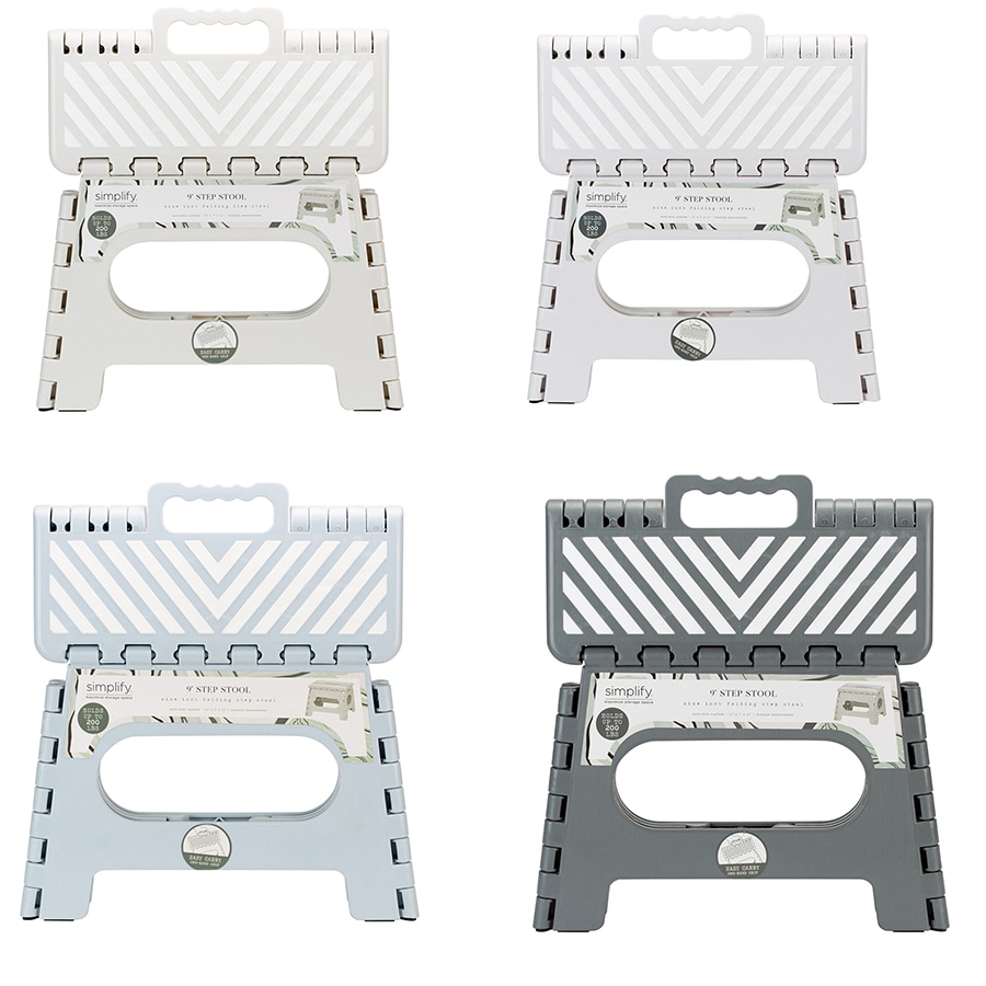 Folding Step Stool This sturdy step stool is perfect for reaching high shelves or cabinets. It has a stripe design that adds a touch of style to any room. The stool folds flat when not in use, making it easy to store in a closet or under a bed.